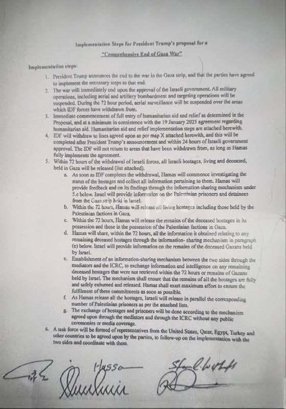 中国记录通讯社(记者:厍红英)央视消息:当地时间9日夜间,以色列公共广播公司Kan发布了以色列、哈马斯和调解员在埃及签署的释放被扣押人员和结束加沙冲突的协议副本。这份文件详细介绍了该协议的各个部分。