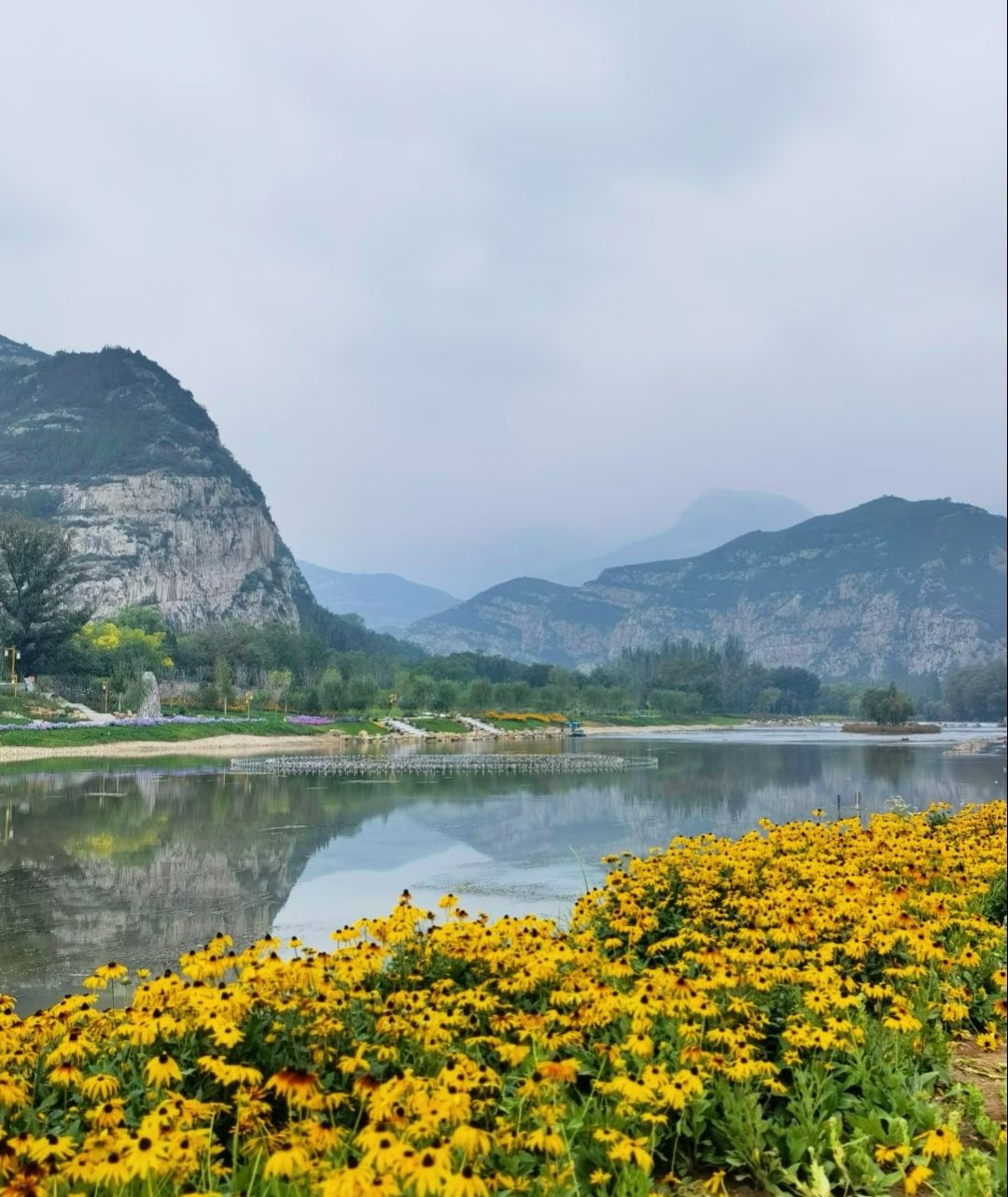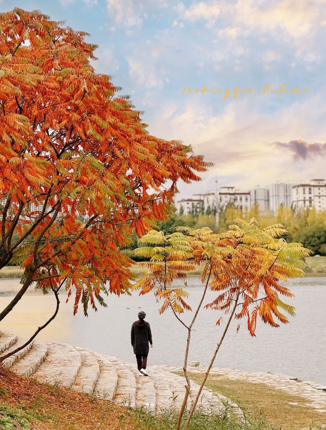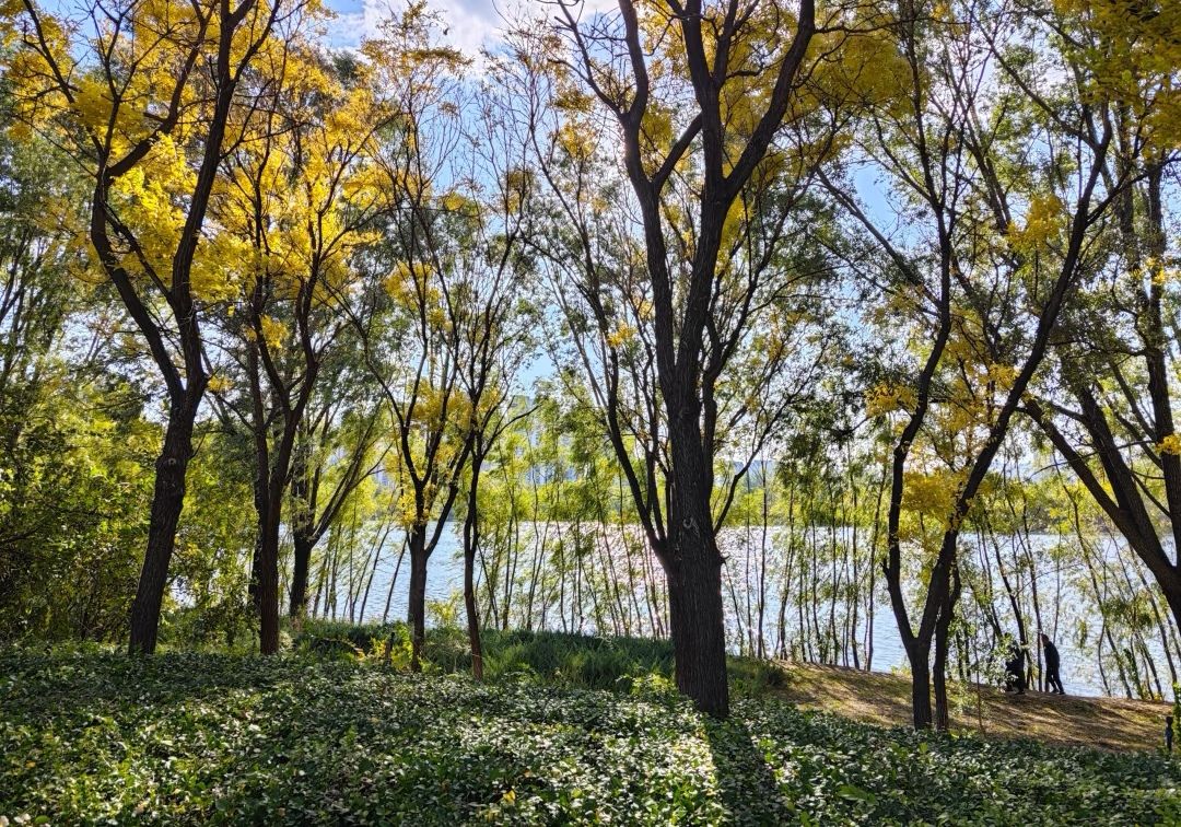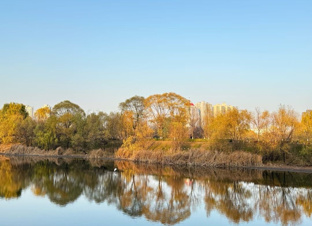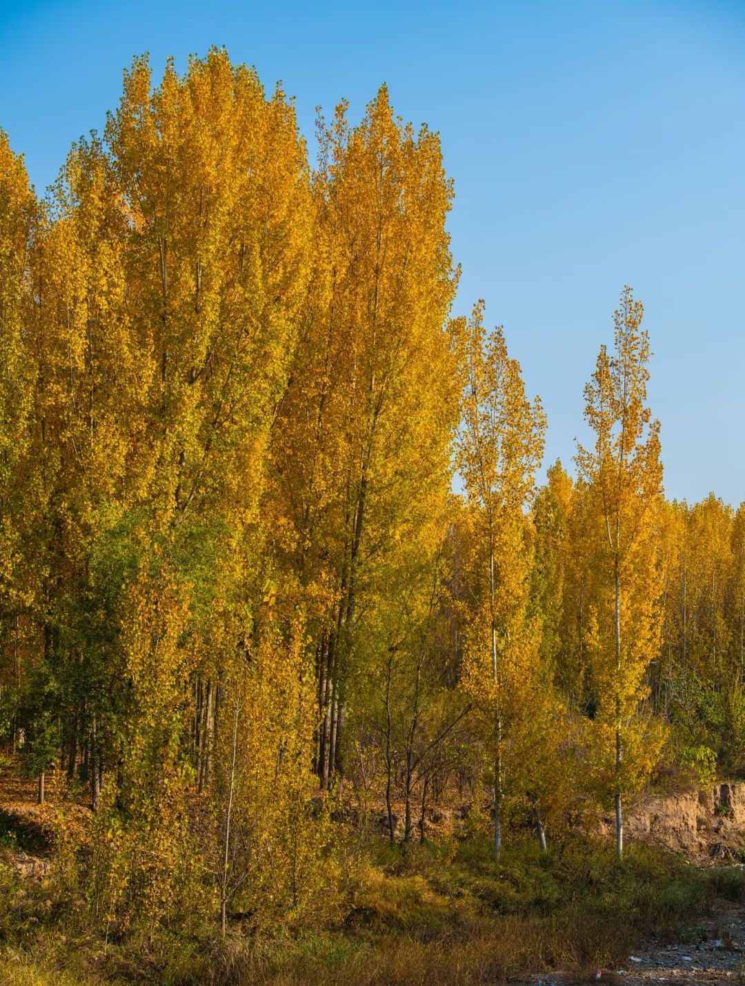 河两岸的树木,像是被大自然打翻的调色盘,五彩斑斓。高大的杨树,叶子变成了金黄色,在阳光的照耀下闪闪发光,一阵风吹过,树叶“沙沙”作响,就像一群穿着金色舞裙的少女在翩翩起舞。银杏树也不甘示弱,扇形的叶子黄得耀眼,远远望去,像是一把把金色的小扇子挂满了枝头。而那些枫树,则像是一团团燃烧的火焰,红得热烈,红得奔放,为这深秋的汾河增添了一抹浓重的色彩。