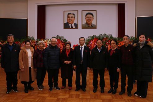 朝鲜驻华使馆参赞郑英三(中),亲切接见中国民间友好代表团成员并合影。