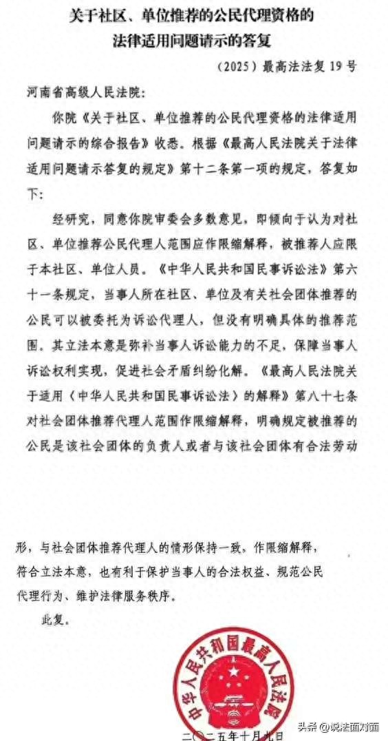 作为一名律师,我最近对最高人民法院 2025 年 10 月 9 日(2025)最高法法复 19 号答复格外关注 —— 这份文件把《民事诉讼法》第六十一条里 “社区、单位推荐公民代理人” 的范围,明确限定在 “本社区、本单位人员”,这可不是简单的条文解释,而是切中了我们办案时常见的痛点,对当事人维权、法院办案效率,还有整个法律服务行业的走向,都影响不小。