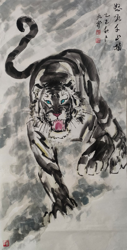 虎为百兽之王,是中华民族精神象征。自古就有“进门堂前先挂虎”之说,是常用来镇宅、安宁、避邪的神灵益兽。加新在年轻时酷爱画虎,20岁时就读于胡运才先生美术学校期间,除了认真临习古今大家山水外,去北京写生、学习时无意中在北京动物园看到真虎,从此将虎的壮美、阳刚、威猛的形象铭记心中,立志把画虎作为一生追求的方向。