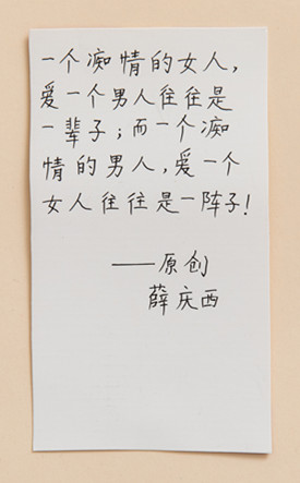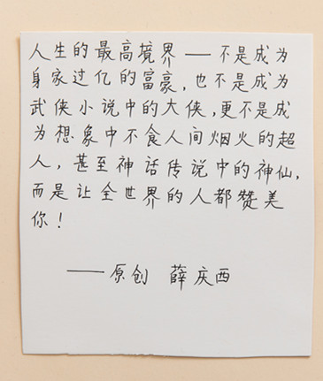 作者的话 亲爱的读者朋友,在业余时间,我长期坚持写了很多妙语,敬希雅正!如果那句作品感动了您,欢迎分享给您的好友,以便让更多的人,能及时看到我的灵感,领悟我的智慧,开始关注我的成长,关心我的成才。如果您有什么感想,请随时联系我!作者邮箱:xueqingxihao@163.com 来信请寄:(276034) 山东省临沂市河东区人民大街1033号 河东区市场监督管理局 薛庆西 收