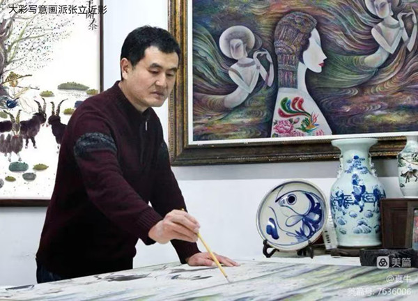 张立先生素以沉静著称。 张立先生是山东工艺美术学院的高材生,获优秀毕业生称号。毕业后我们一直就是同事。他不善言辞,与人交往时少了客套寒暄,却总以最诚挚的态度待人接物,那份质朴如同他画中未经雕琢的线条,纯粹而动人。多年来,他始终沉潜于画室,将所有精力倾注于笔墨色彩之间,在对传统与现代的反复研磨中,让大彩写意的语言日渐成熟。这份“板凳甘坐十年冷”的潜心,最终使其突破藩篱,开创独树一帜的画派风格,成为当代大彩写意领域当之无愧的大家,其作品中那份不事张扬的厚重,恰是他为人与创作态度的生动写照。