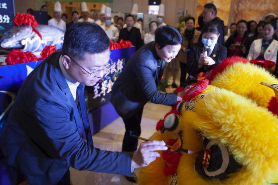 当天下午17点08分,伴随着现场舞狮的铿锵鼓声,开鱼仪式正式开始。舞狮表演的融入,既彰显了酒店对这一顶级食材的尊重,也蕴含着对食材的敬畏与专业的匠心。随着酒店领导完成点睛与剪彩,现场宾客掌声雷动,开鱼仪式的气氛正式推向顶峰。