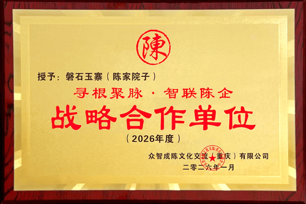 近日,众智成陈文化交流(重庆)有限公司、涪陵陈氏宗亲会正式为涪陵长江三桥下磐石玉寨山庄(陈家院子)授牌,授予其“寻根聚脉,智联陈企”战略合作单位。负责人陈普发接牌,双方达成战略合作,以亲情为纽带、以公益为初心,开启宗亲互助、以商养善的全新模式。