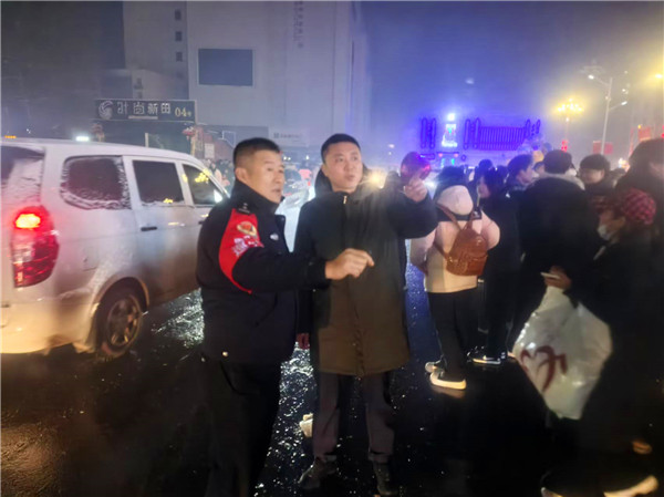 跨年夜的街头,雪花簌簌飘落,气温骤降。受节日出行和降雪天气双重影响,城区各主干道、商圈周边车流量大幅增加,部分路段出现缓行状况。郭昊副局长顶风冒雪赶赴各个易拥堵点位,在车流密集的十字路口实地查看路况,详细了解车辆通行情况,现场指挥调度警力,科学调整疏导方案。