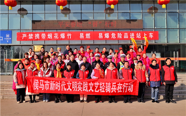 (本网山西讯:于妮妮 秦明忠)为切实做好2026年春运道路交通安全管理工作,为侯马群众新春佳节创造一个平安畅通的道路交通环境,2月2日上午9:30分,侯马西客运站举行了2026年“文明交通、安全同行”主题春运启动仪式。文明实践文艺轻骑兵团队应邀到现场开展文艺演出,助力2026年春运启动。