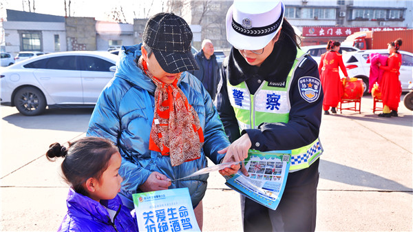 民辅警给过往顾客发放交通安全宣传单