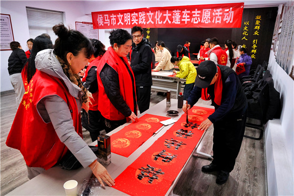(本网山西讯:于妮妮 秦明忠)马年将至,翰墨传情。2月7日上午9点,星期六,农历腊月二十,侯马市新时代文明实践中心“文化大篷车”和“文艺轻骑兵”两个实践项目团队,联合浍滨街道办事处文明实践所,开展了一场“笔墨迎春·祝福到家”迎新春送春联志愿服务活动。