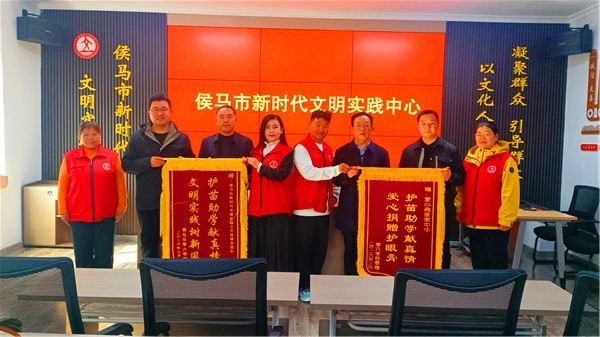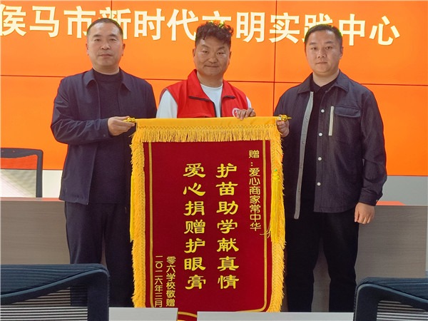 2026年3月11日侯马市零六学校校长牛柴军代表全校师生,向侯马市新时代文明实践文艺轻骑兵团队赠送了写有:“护苗助学献真情 文明实践树新风”、“护苗助学献真情 爱心捐赠护眼膏”的两面锦旗,以此表达对团队的爱心资助与无私奉献的诚挚谢意。